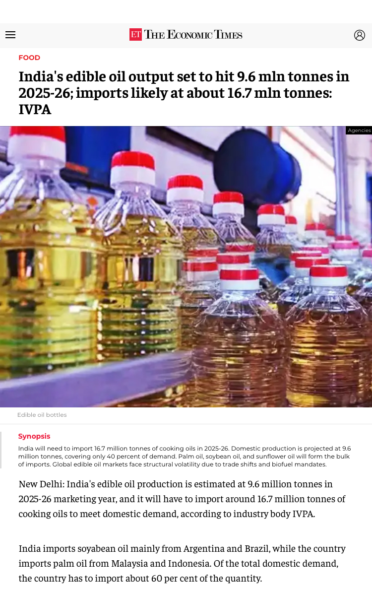 IVPA expects veg oil import to be at 16.2 mt during the 2023-24 (Oct-Sep) edible oil season against